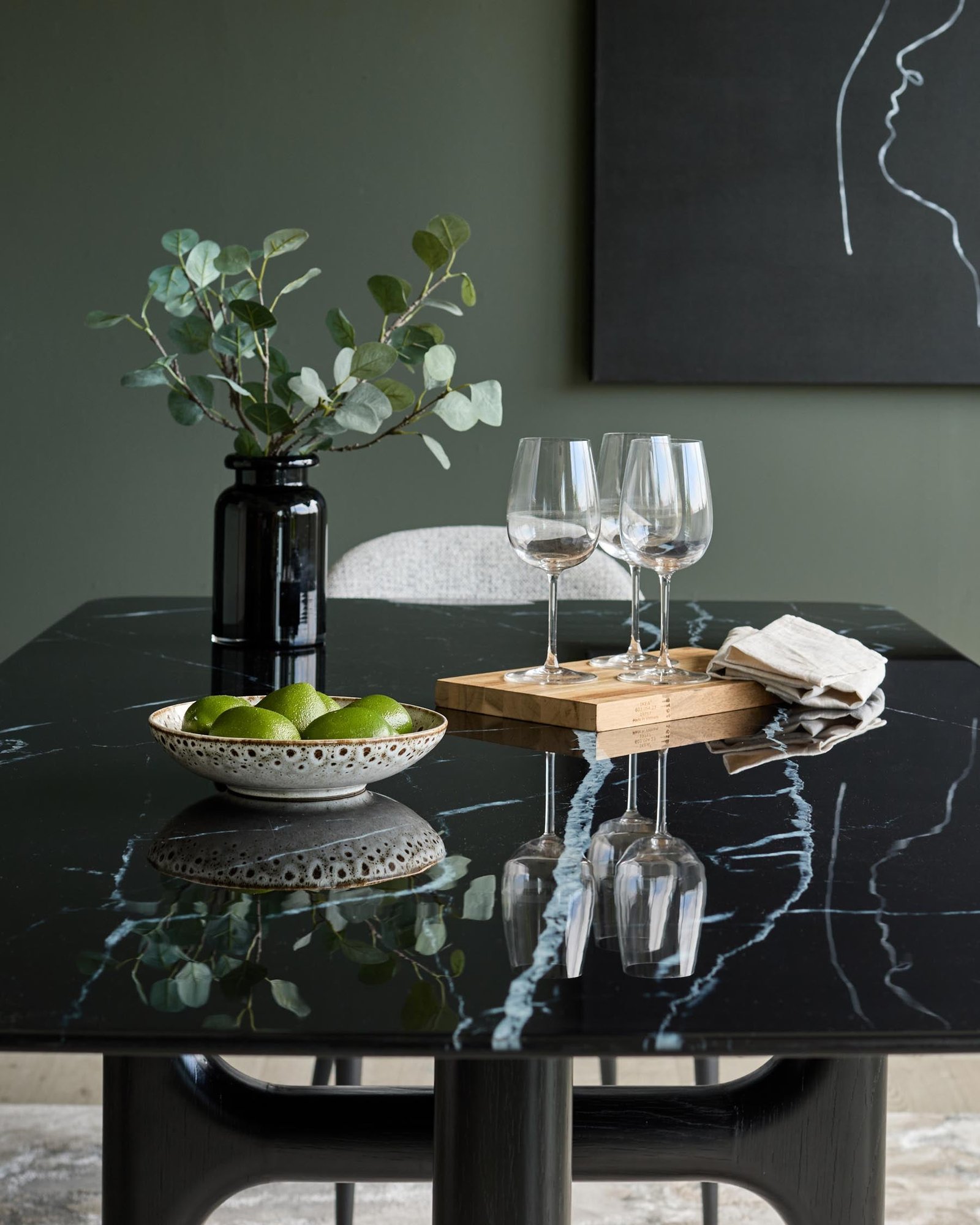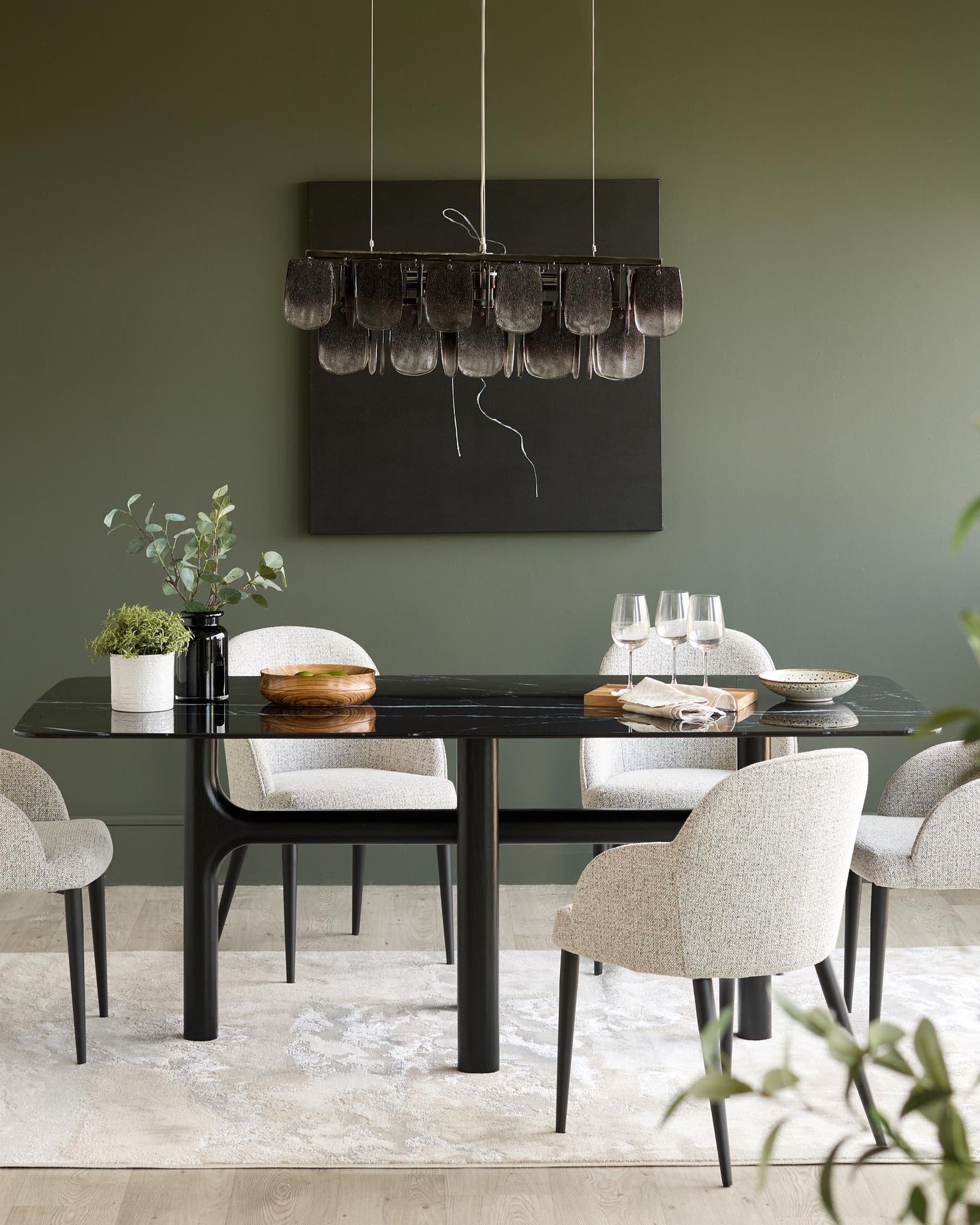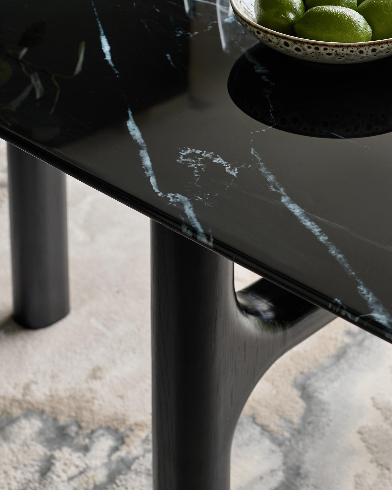 The Brixton black ceramic dining table brings sophisticated drama to your dining space. Its striking Marine Black ceramic top offers the luxurious look of marble with impressive heat and scratch resistance – perfect for everything from morning coffee to dinner parties. The architectural pedestal base, with four cylindrical legs joined by crossbars, creates visual interest while comfortably seating 6.