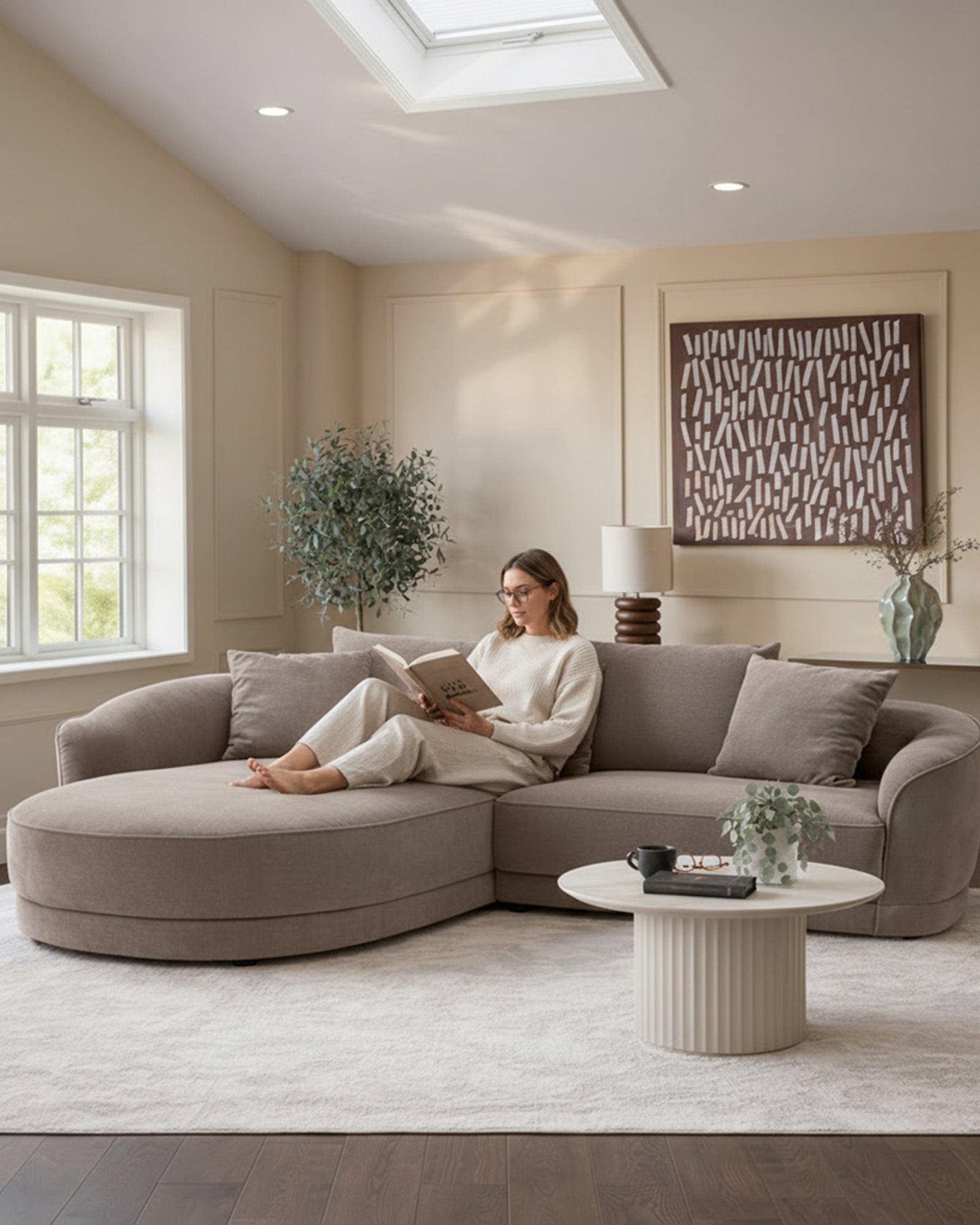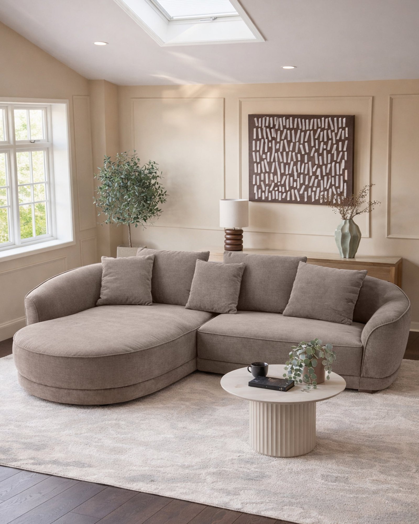 The Caspian left hand corner chaise sofa brings calm sophistication to your living space with its soft mink chenille upholstery and gently rounded silhouette. The integrated chaise invites you to stretch out solo or settle in for longer gatherings, while chunky piped edges add definition without formality.