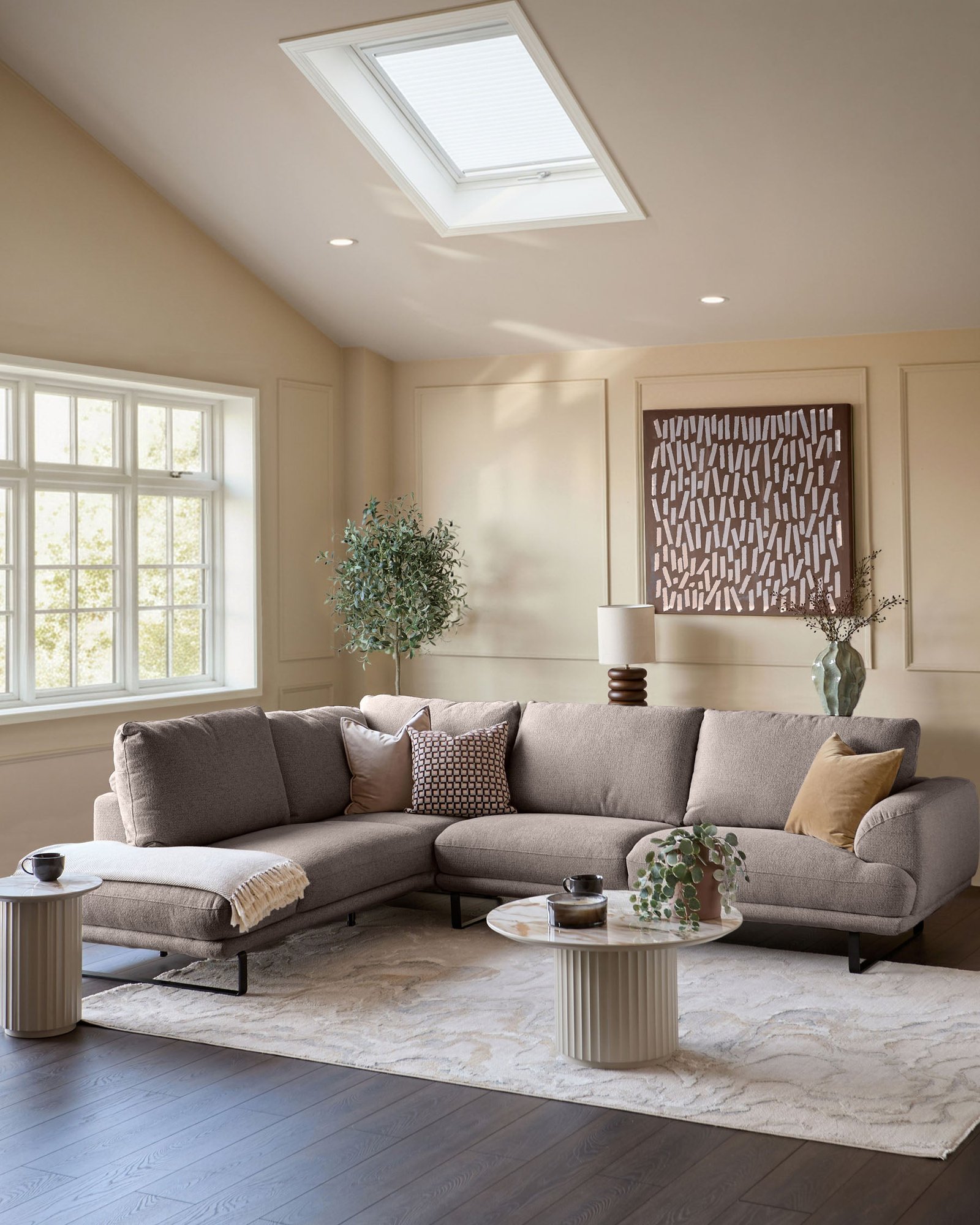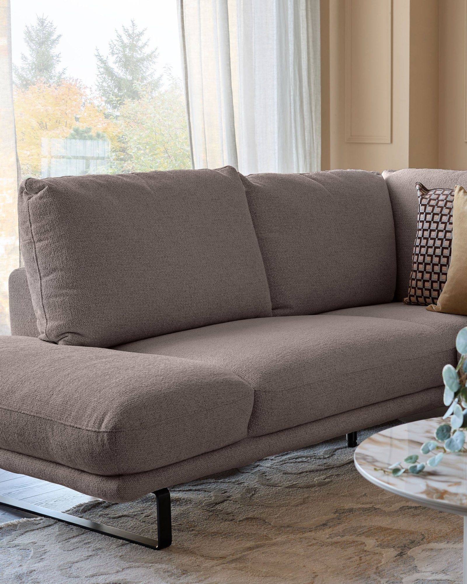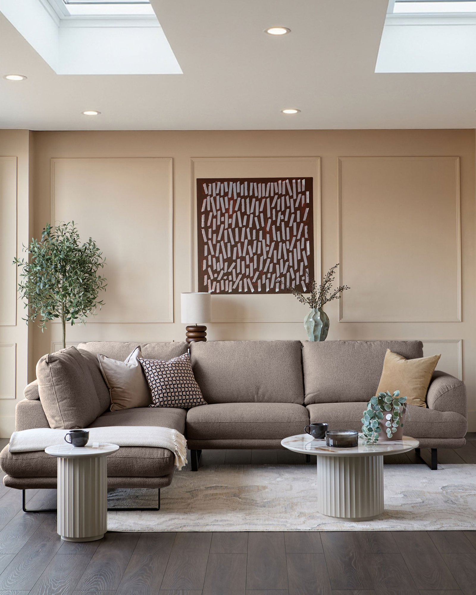 The Colette mink chenille left hand corner chaise sofa brings together comfort and contemporary design in one beautifully crafted piece. Its sculpted silhouette features an integrated armrest that flows seamlessly into generous seat cushions, creating the perfect spot for both lively gatherings and quiet evenings. The soft chenille upholstery in warm mink adds texture and sophistication to any living space.