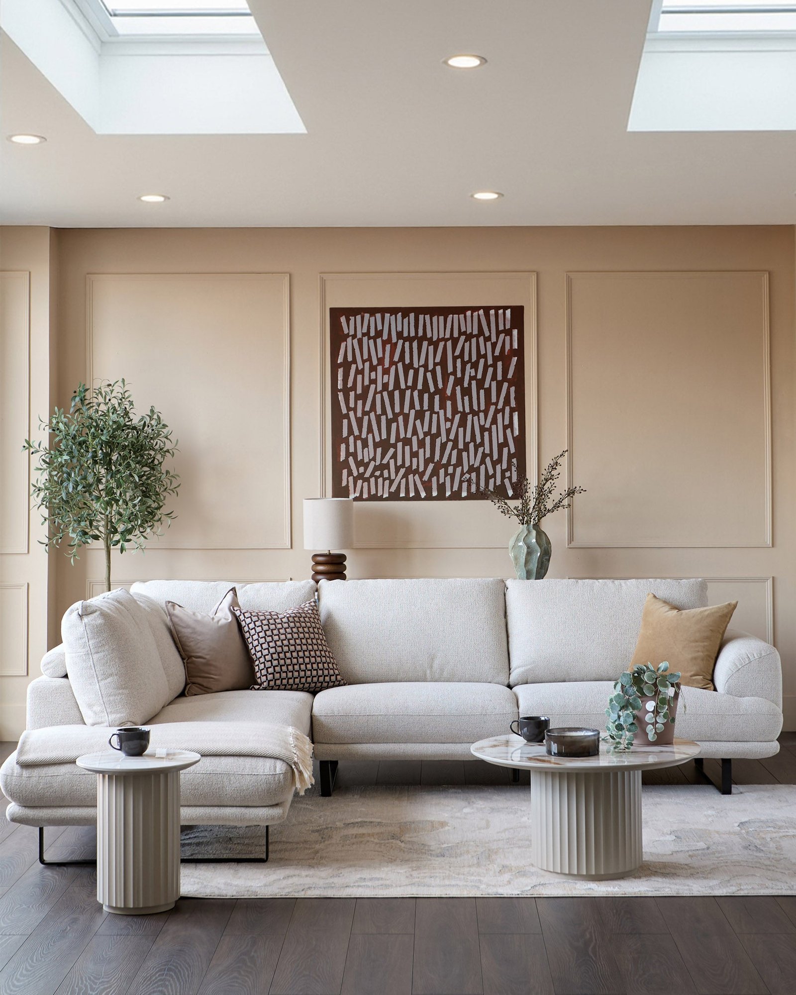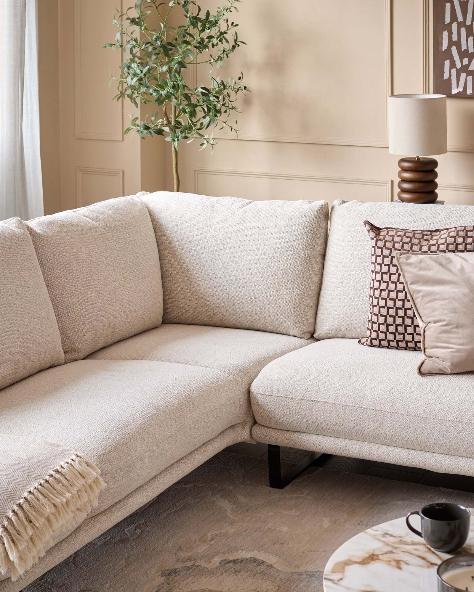 The Colette natural fabric left hand corner chaise sofa brings refined comfort to your living space. Upholstered in soft, textured chunky chenille, this 4-seater features a distinctive plinth base and high loop-style legs that create a light, minimal aesthetic. The left-hand chaise invites relaxed lounging, perfect for open-plan spaces or cosy corners where conversation flows naturally.