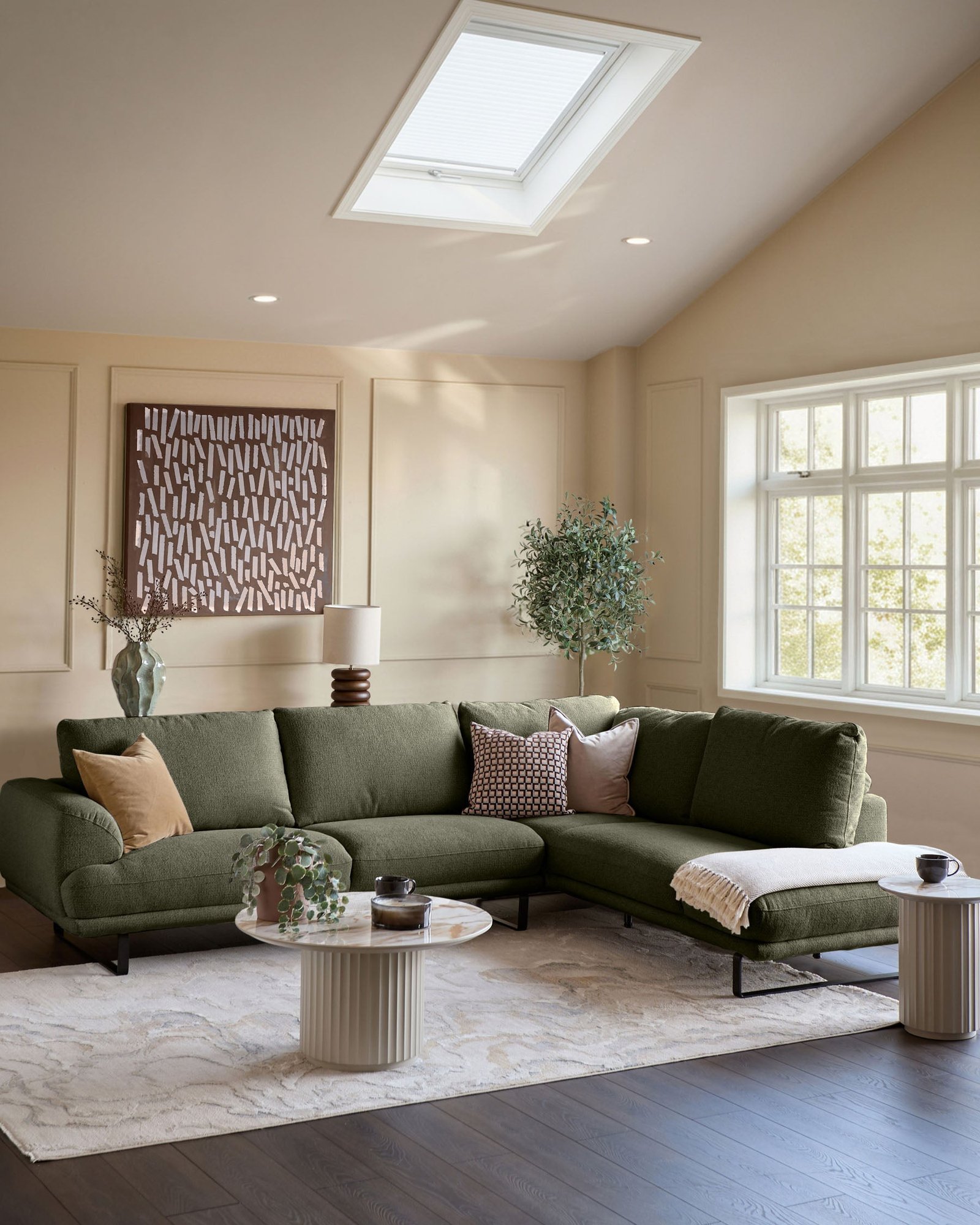 The Colette olive green chenille right hand corner chaise sofa brings warm sophistication to your living space with its sculptural design and generous proportions. This right-hand configuration naturally opens up your room, creating an inviting hub for relaxed conversations and lazy afternoons. The integrated armrest flows seamlessly into the seat, while high loop-style legs give it a modern, floating appearance that never overwhelms your space.
