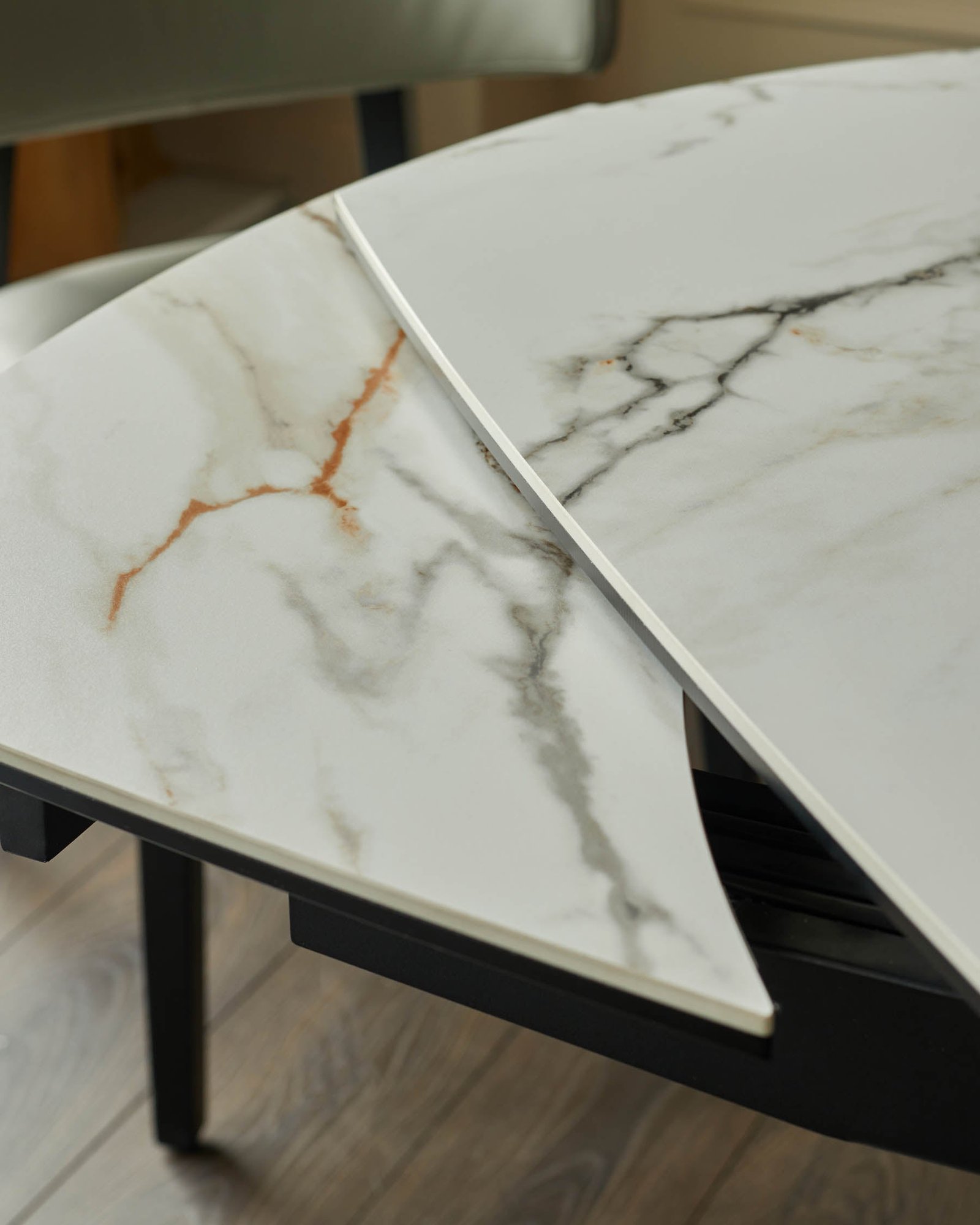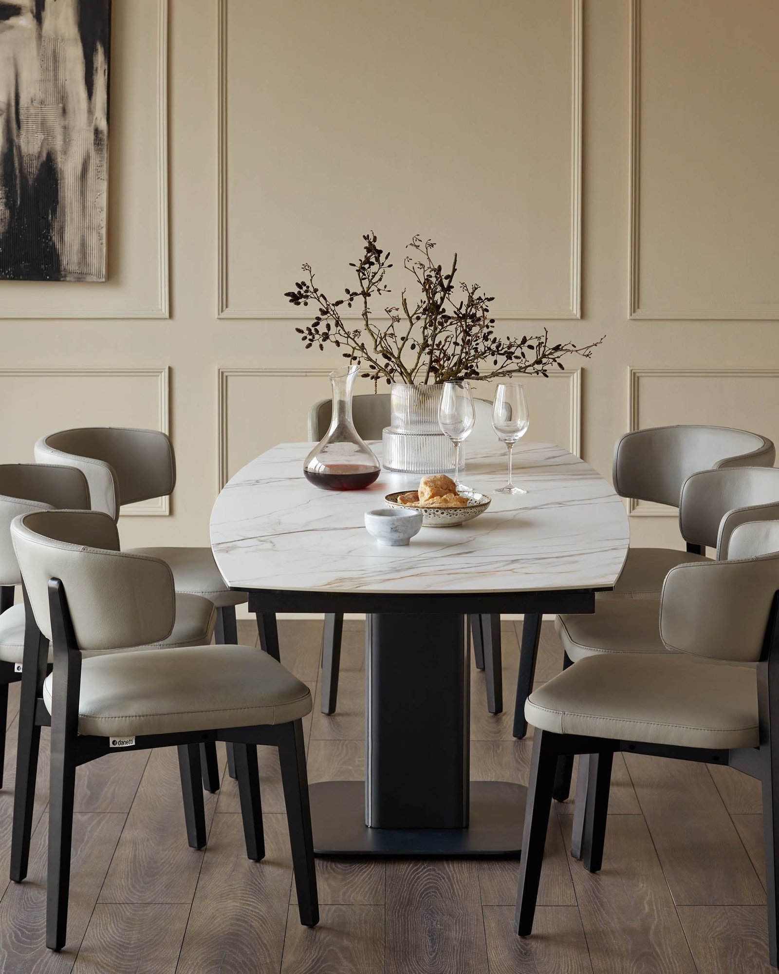 The Fraser natural ceramic extending dining table adapts seamlessly to your needs, rotating smoothly from an intimate 4-seater to a spacious 6-seater configuration. Its resilient ceramic top in a natural matt finish stands up to hot dishes and daily use, while the sleek black metal pedestal base provides stability without crowding legs underneath. Perfect for everything from weekday breakfasts to weekend dinner parties.