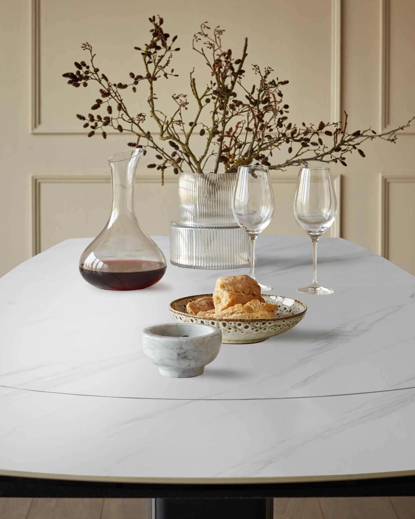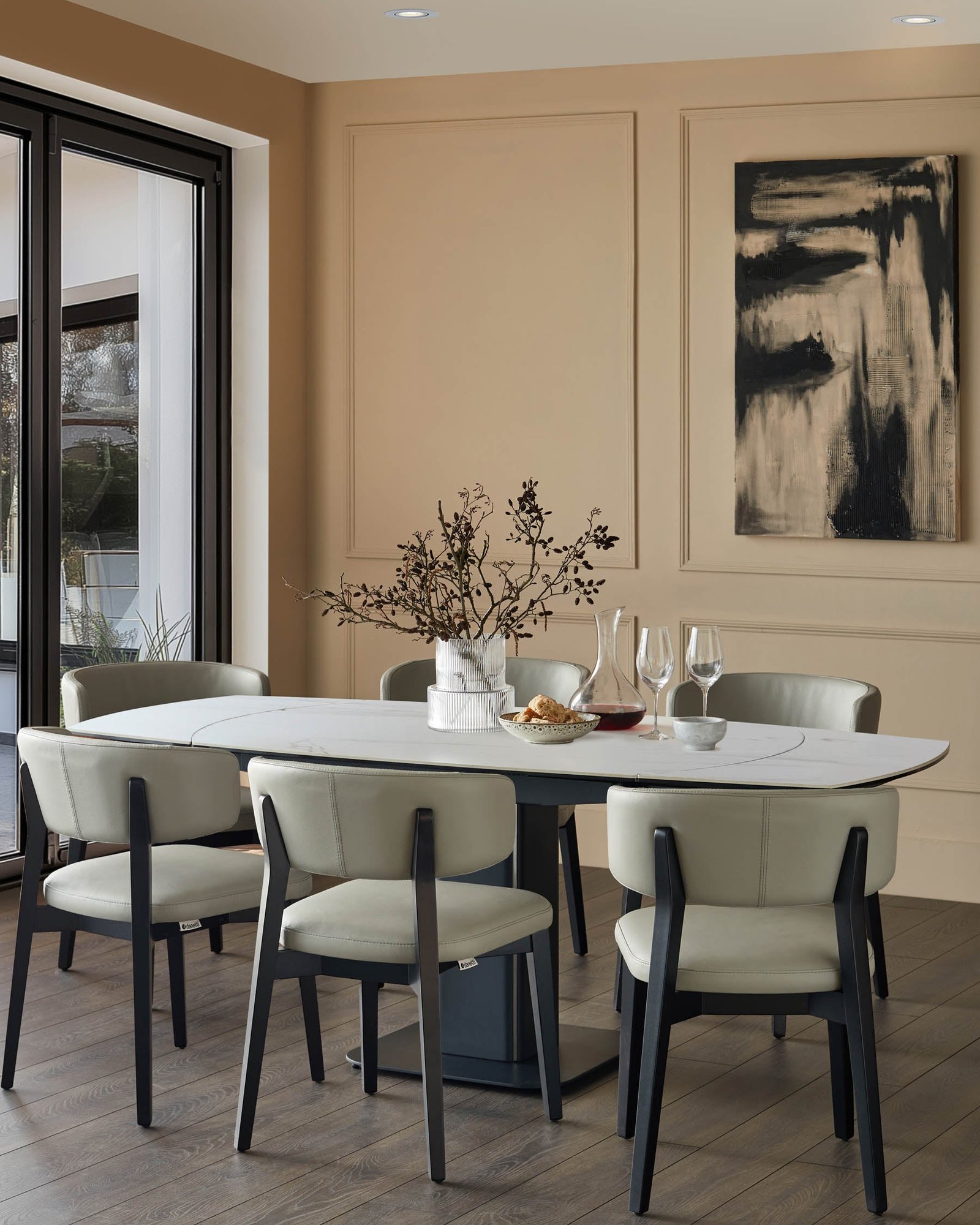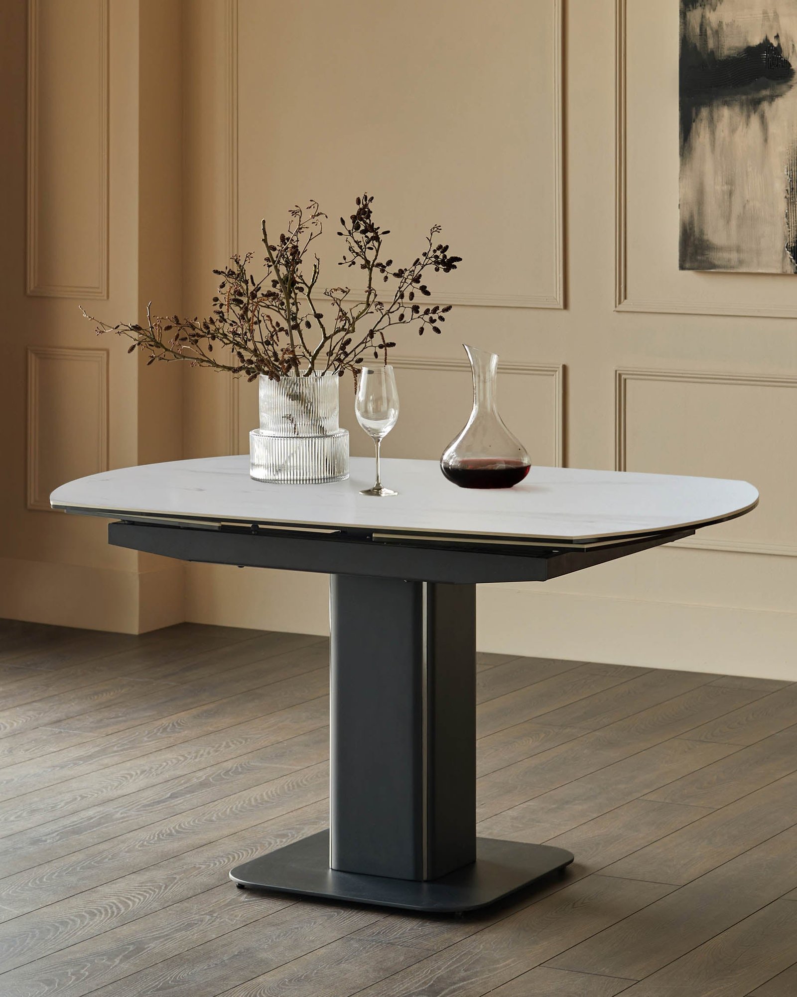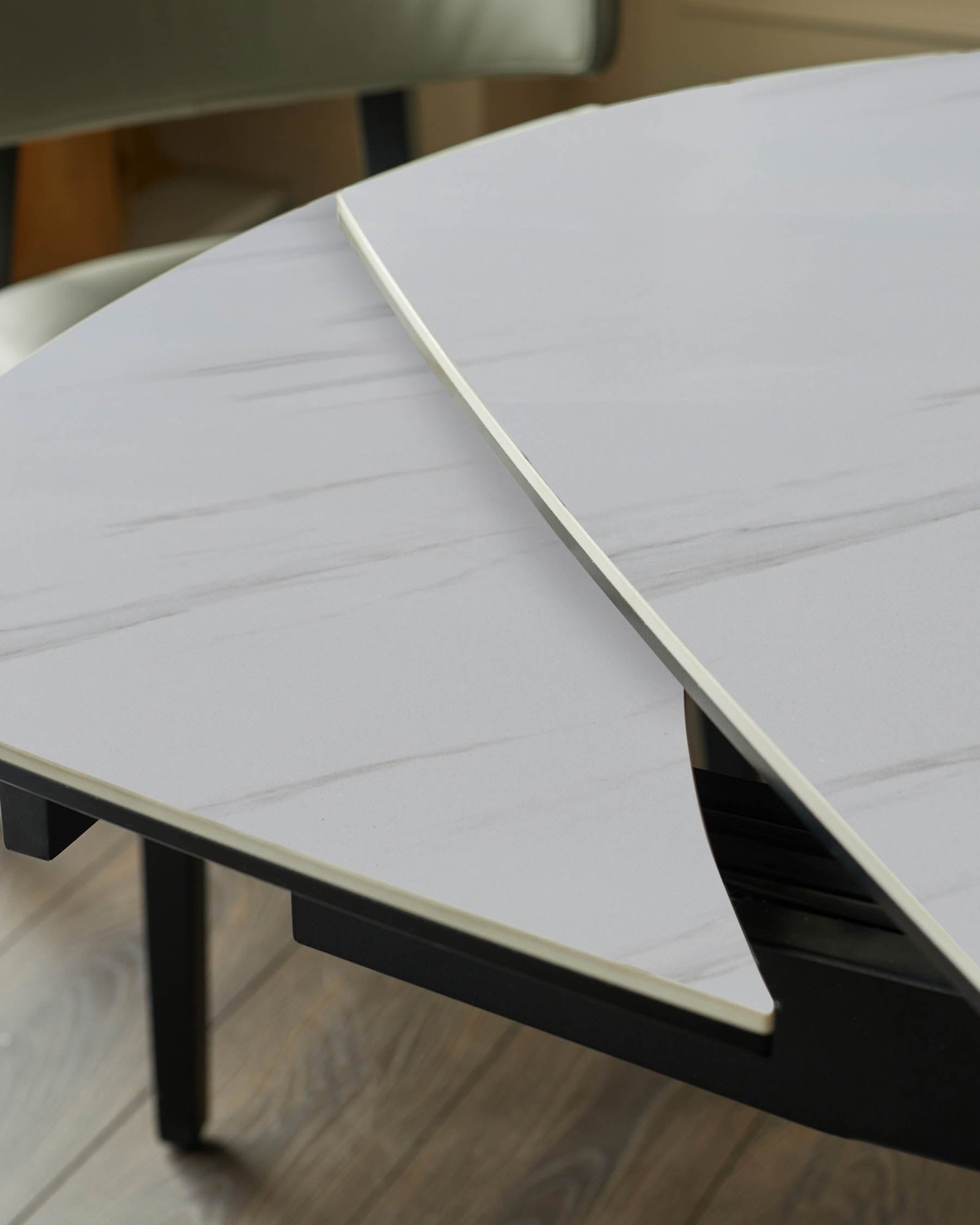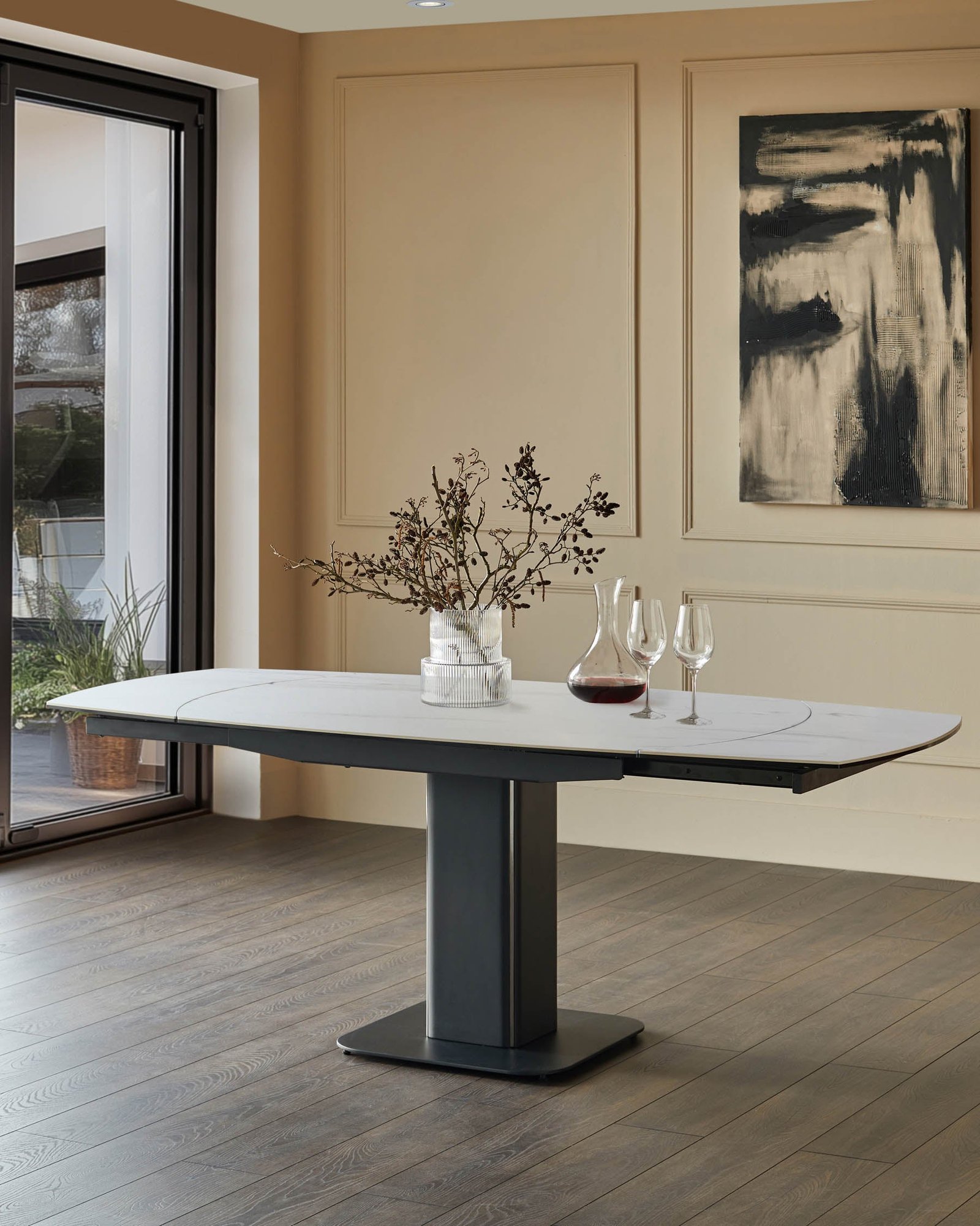 The Fraser white ceramic extending dining table adapts effortlessly to your needs, transitioning smoothly from an intimate 4-seater to a spacious 6-seater with its innovative rotating mechanism. The oval ceramic tabletop features a subtle marble-like pattern that brings refined texture to your dining space, while the heat and scratch-resistant surface handles everything from morning coffee to dinner parties with ease.