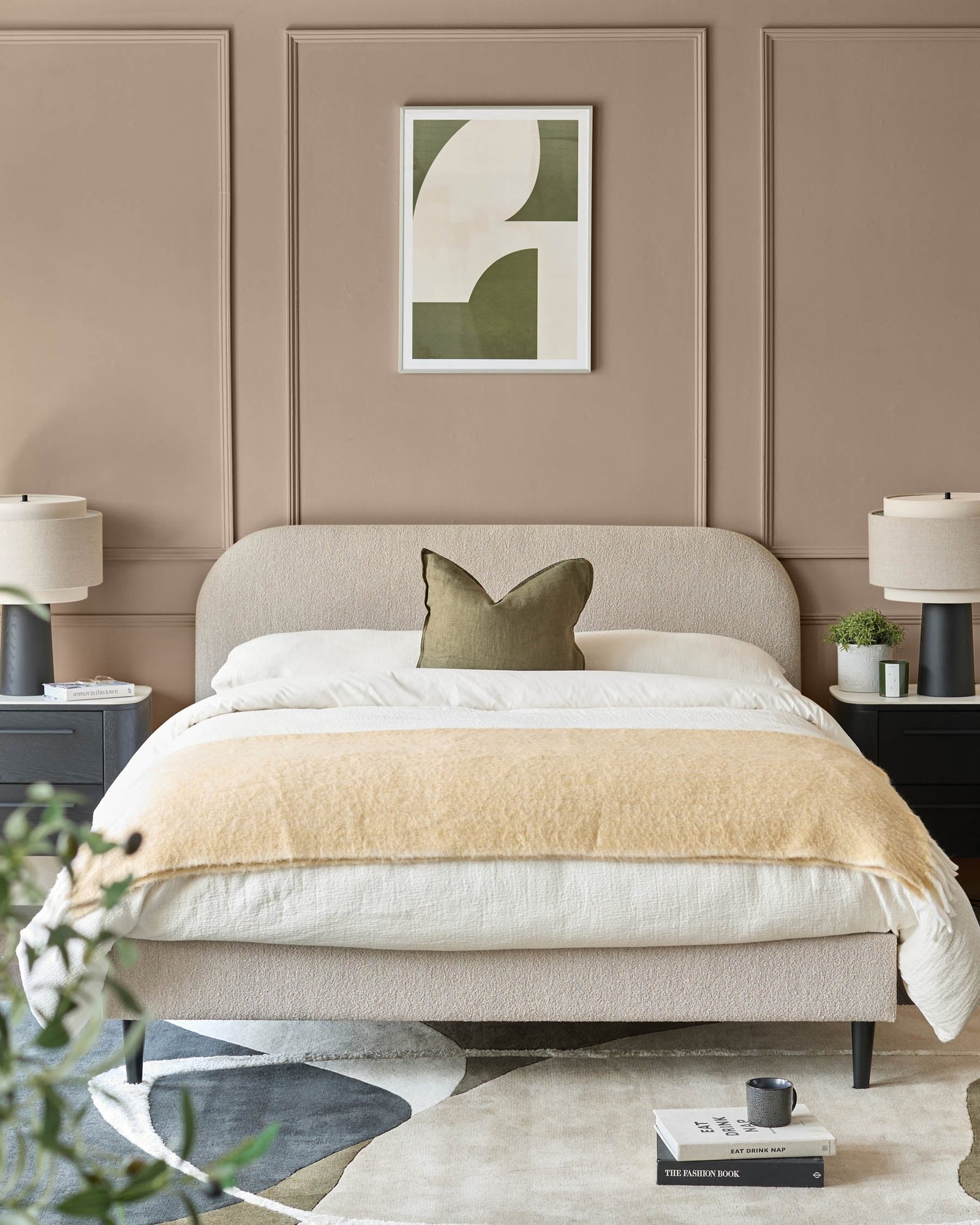 The Hampton natural soft boucle double bed brings quiet sophistication to your bedroom with its beautifully textured upholstery in warm cream. This thoughtfully designed piece combines the tactile appeal of soft boucle fabric with sleek black tapered legs, creating a versatile foundation for both main and guest bedrooms. Built with sprung slats and webbing for superior comfort.