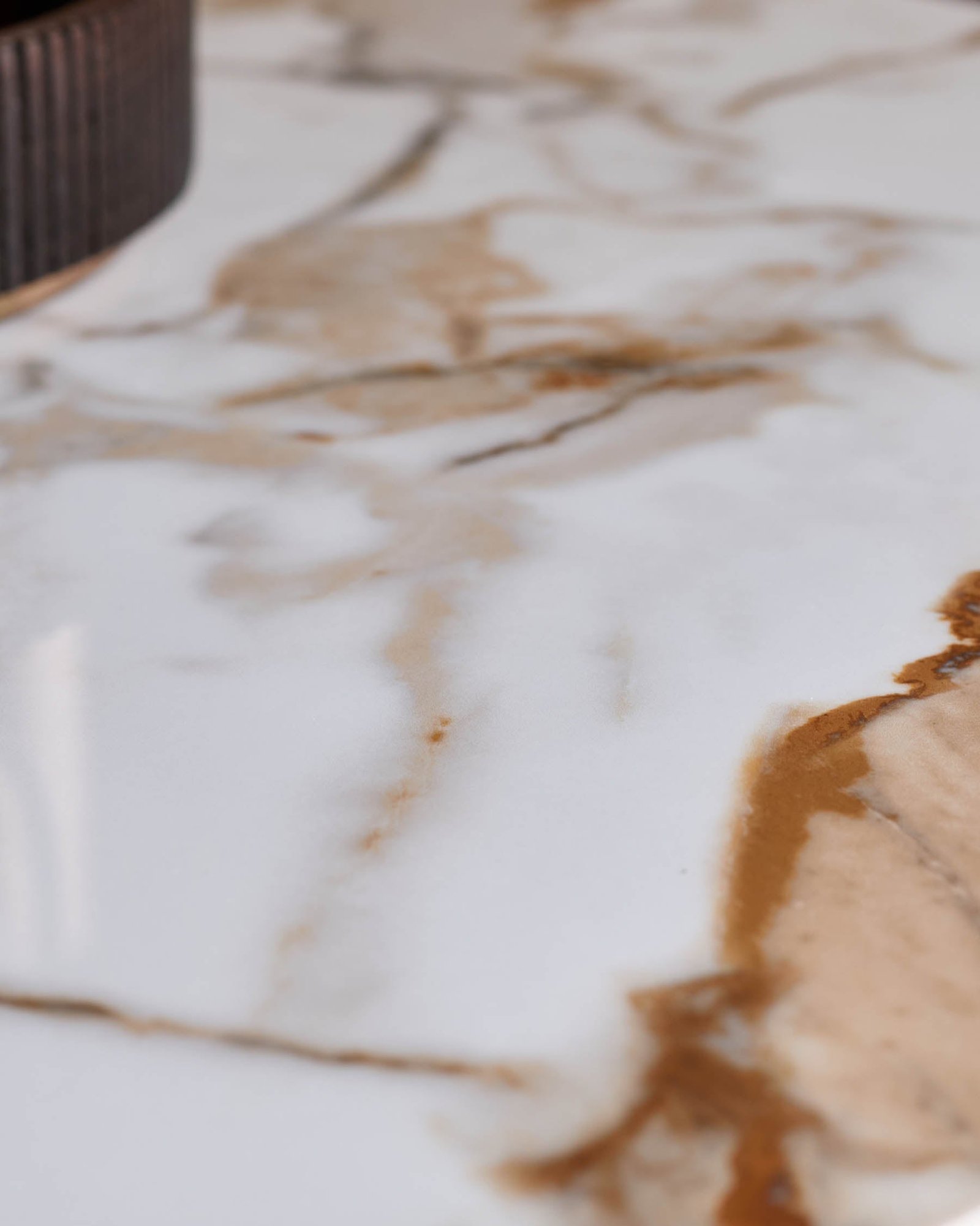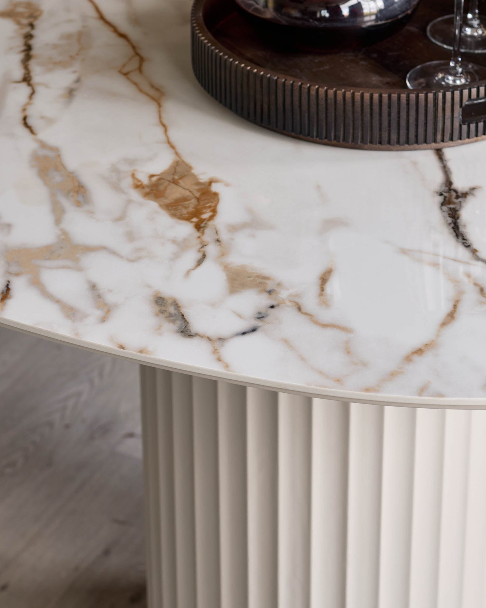 The Hanne natural ceramic 6 seater dining table brings architectural elegance to your dining space. Its high-gloss ceramic top showcases an intricate natural-effect finish, while twin pedestal bases with fluted panelling create visual interest. The double pedestal design provides generous legroom for 6, making both weeknight dinners and special gatherings comfortable and stylish.