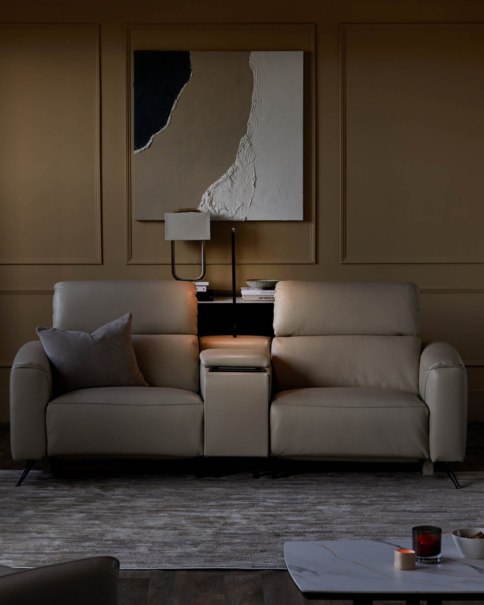 The Kenzie natural grey leather recliner 2 seater sofa brings cinema-quality comfort to your living room. Upholstered in luxurious genuine leather, this contemporary sofa features powered footrests and headrests that adjust to your perfect position. The integrated console table includes cup holders, wireless charging and adjustable LED lighting, making movie nights or quiet evenings equally indulgent.