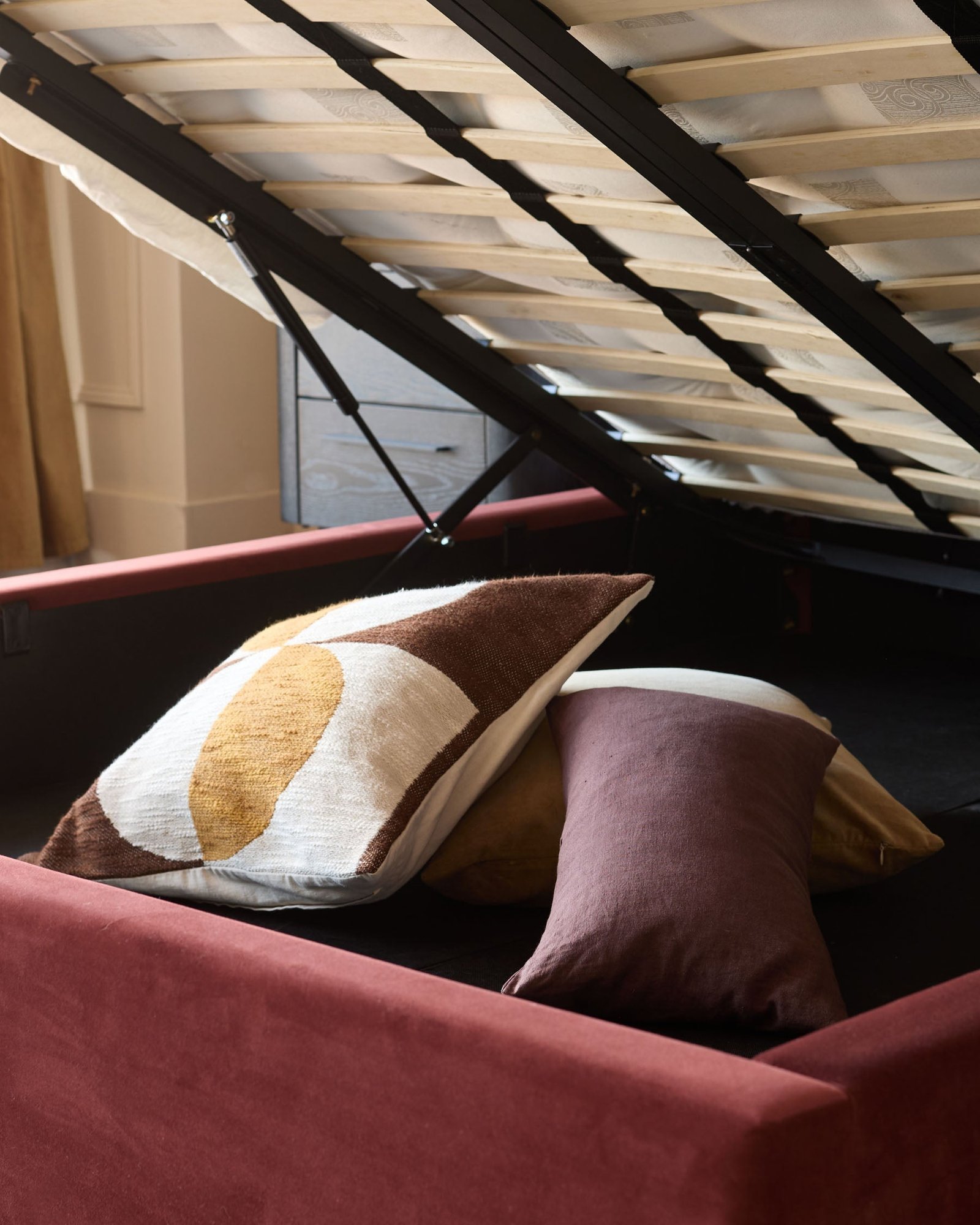 Transform your bedroom with the Leona toffee red velvet double ottoman storage bed – a smart solution that combines luxurious comfort with clever storage. The rich toffee red recycled velvet upholstery brings warmth and sophistication, while the hydraulic ottoman base lifts effortlessly to reveal 15cm of spacious storage for bedding and seasonal items. Perfect for compact spaces where every inch counts.