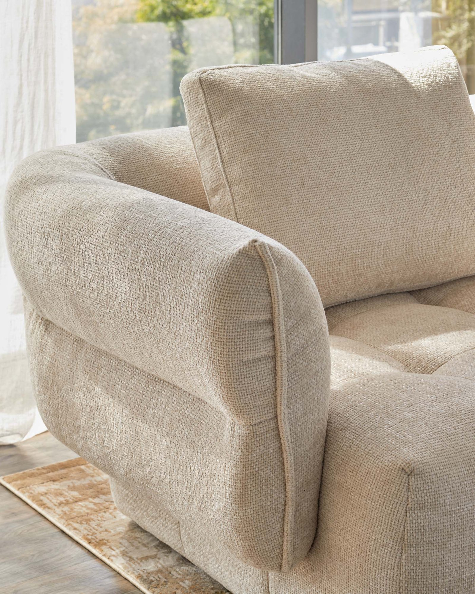 The Lillian natural weave 3 seater sofa brings sculptural beauty to your living space with its graceful curves and distinctive fluted arms. Upholstered in textured cream woven fabric, this generously proportioned sofa seats 3 comfortably. Its fully covered back means you can position it anywhere in your room, making it perfect for open-plan living or creating distinct zones.