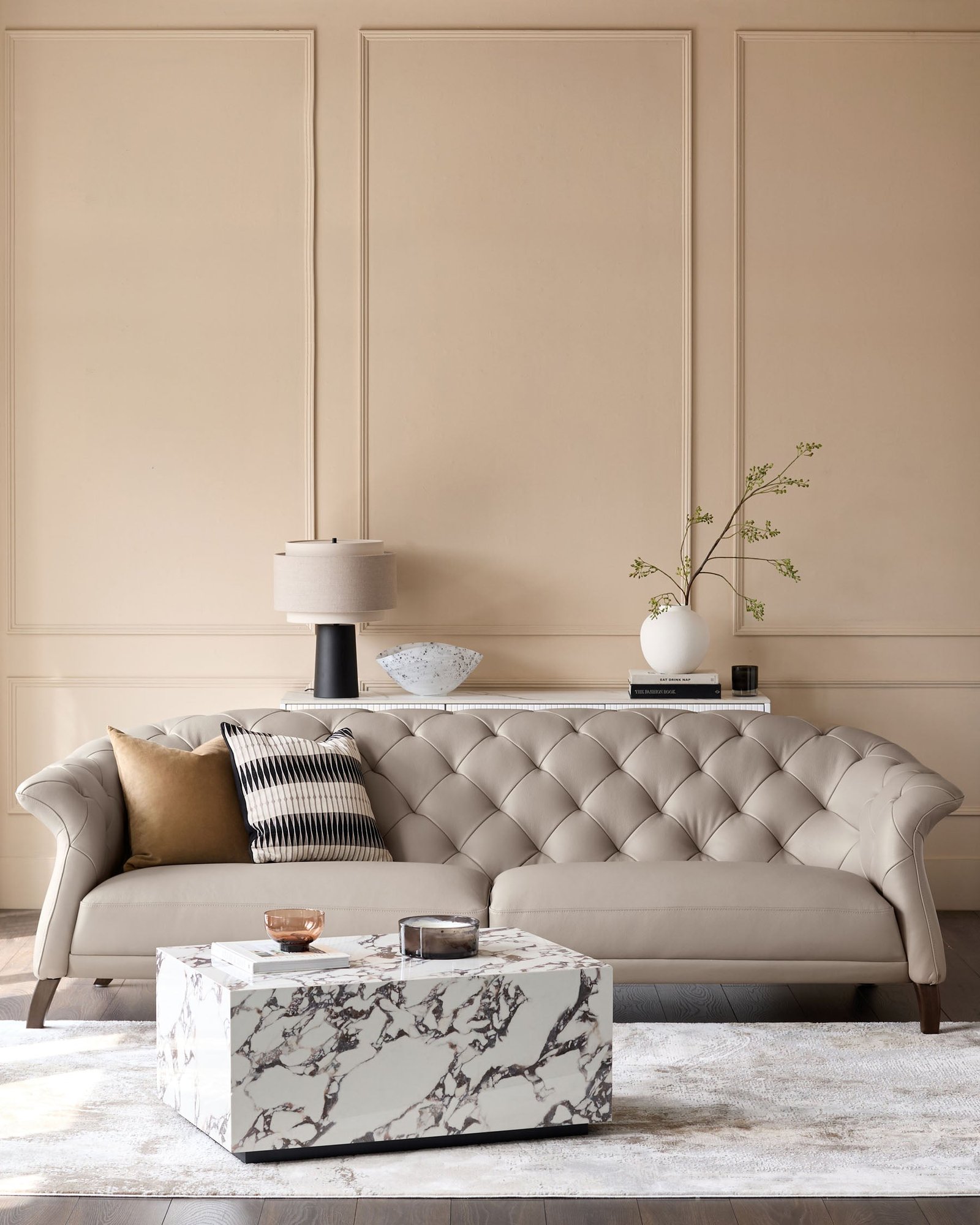 The Luxe natural leather 3 seater sofa brings timeless Chesterfield sophistication to your living space. Upholstered in 100% top-grain leather with deep button detailing and elegantly scrolled arms, this statement piece offers medium-sit comfort with premium support. Dark wood feet complete the refined look, making it perfect for spacious lounges where style meets comfort.