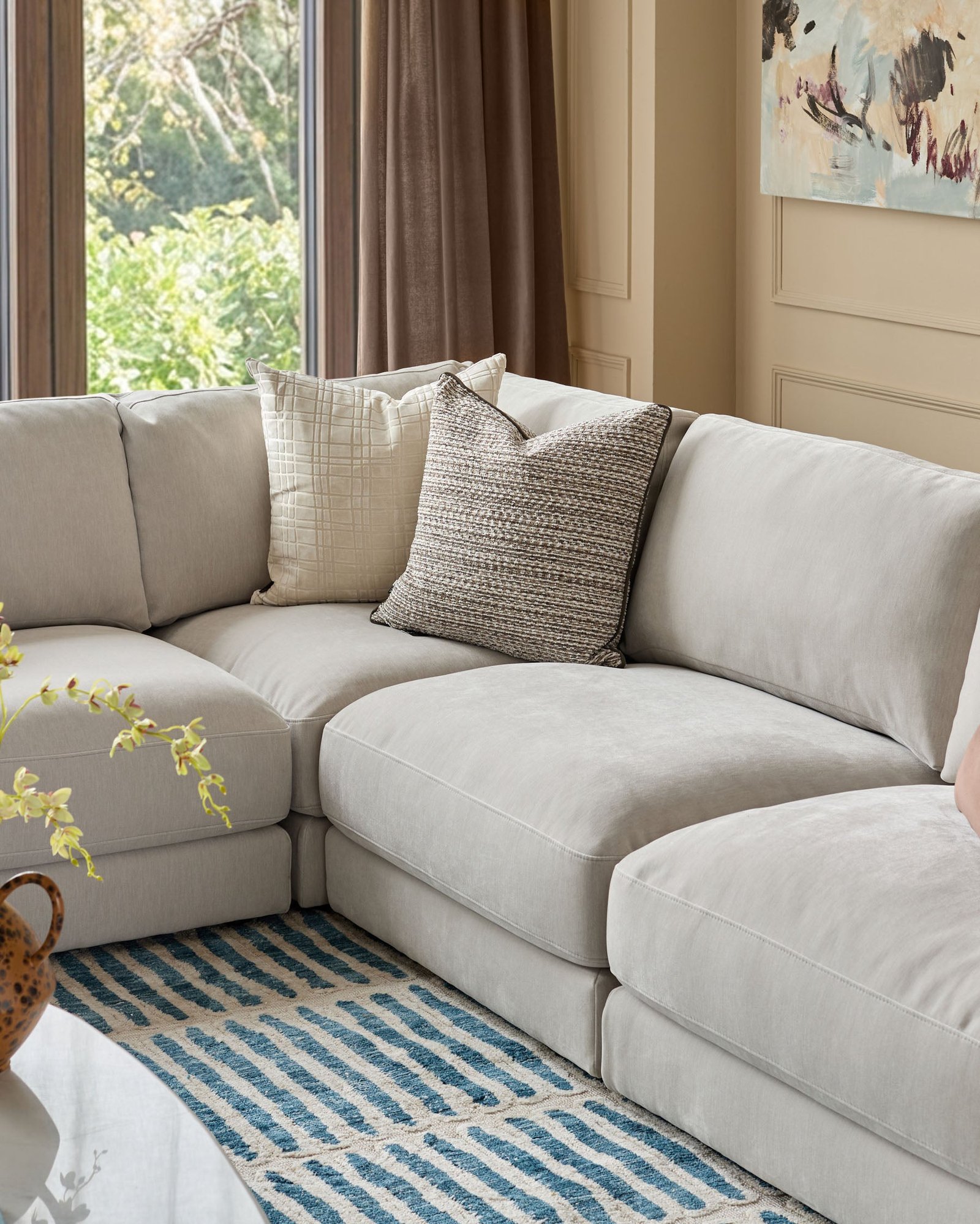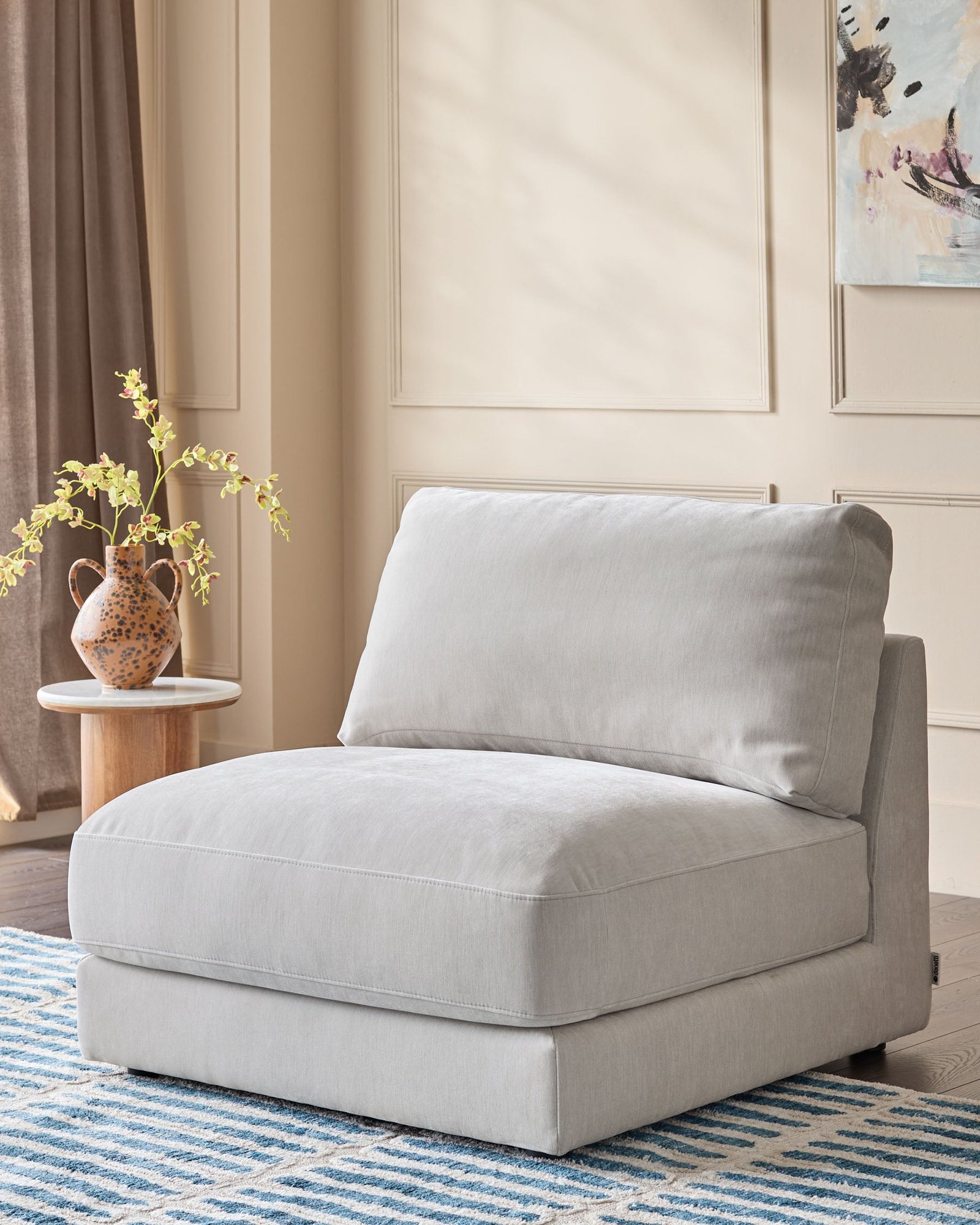 The Lynetta natural grey chenille sofa module offers the perfect starting point for a sofa that grows with your life. This single module works brilliantly alone as an accent chair or combines with other Lynetta pieces to create your ideal configuration. The soft chenille fabric in natural grey brings gentle texture and warmth to your space, while deep, supportive cushioning ensures comfort that lasts through movie marathons and lazy Sunday afternoons.