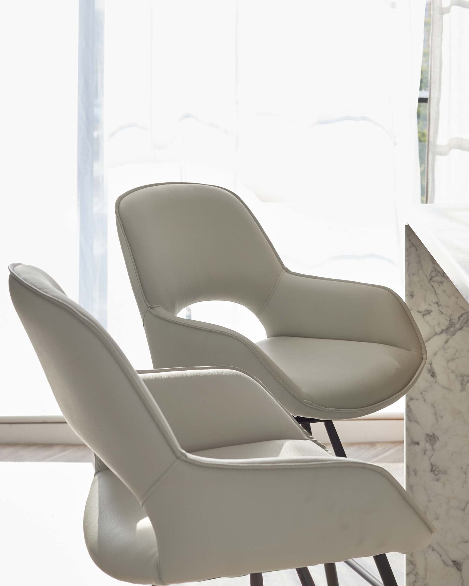 - Light grey faux leather upholstery
