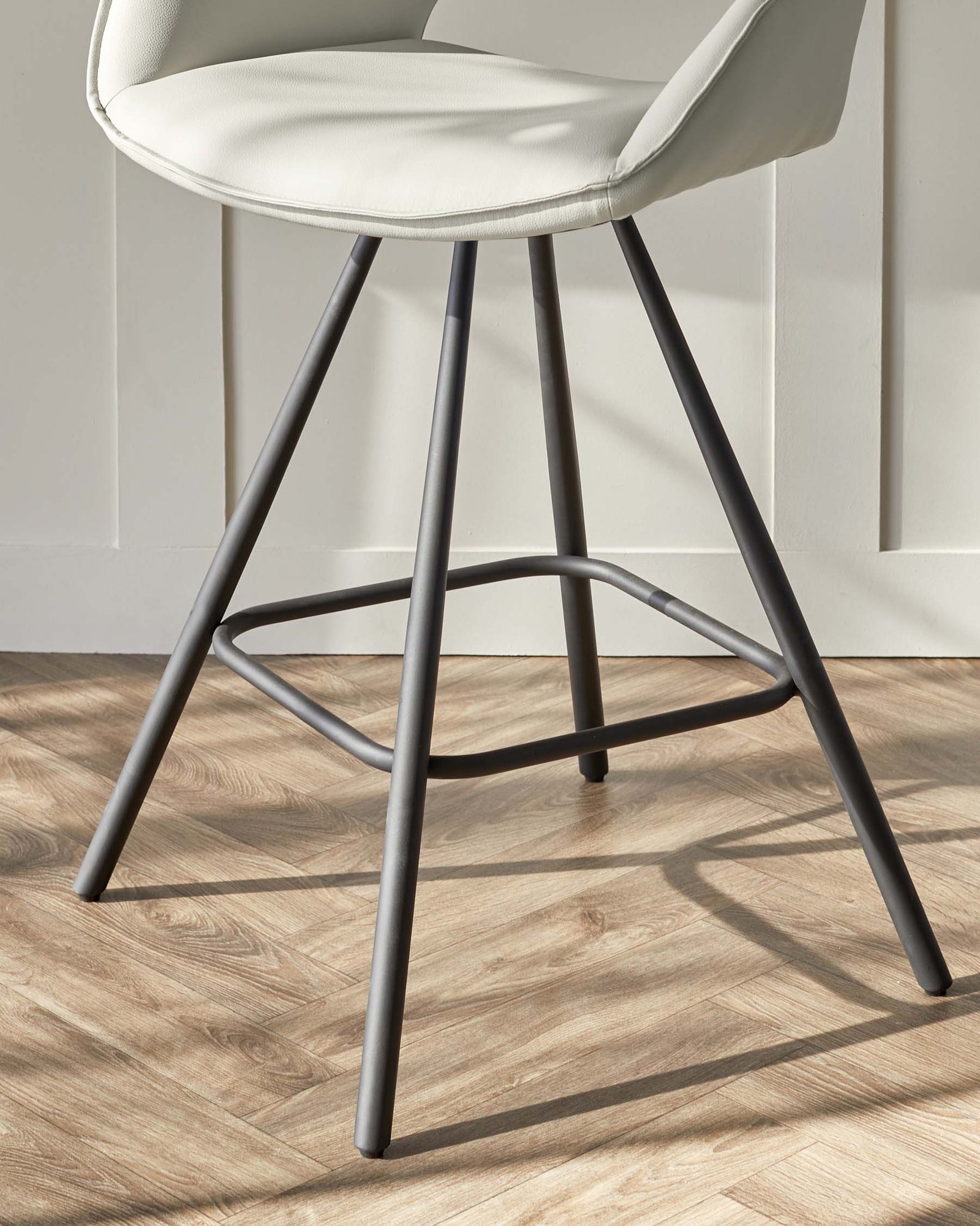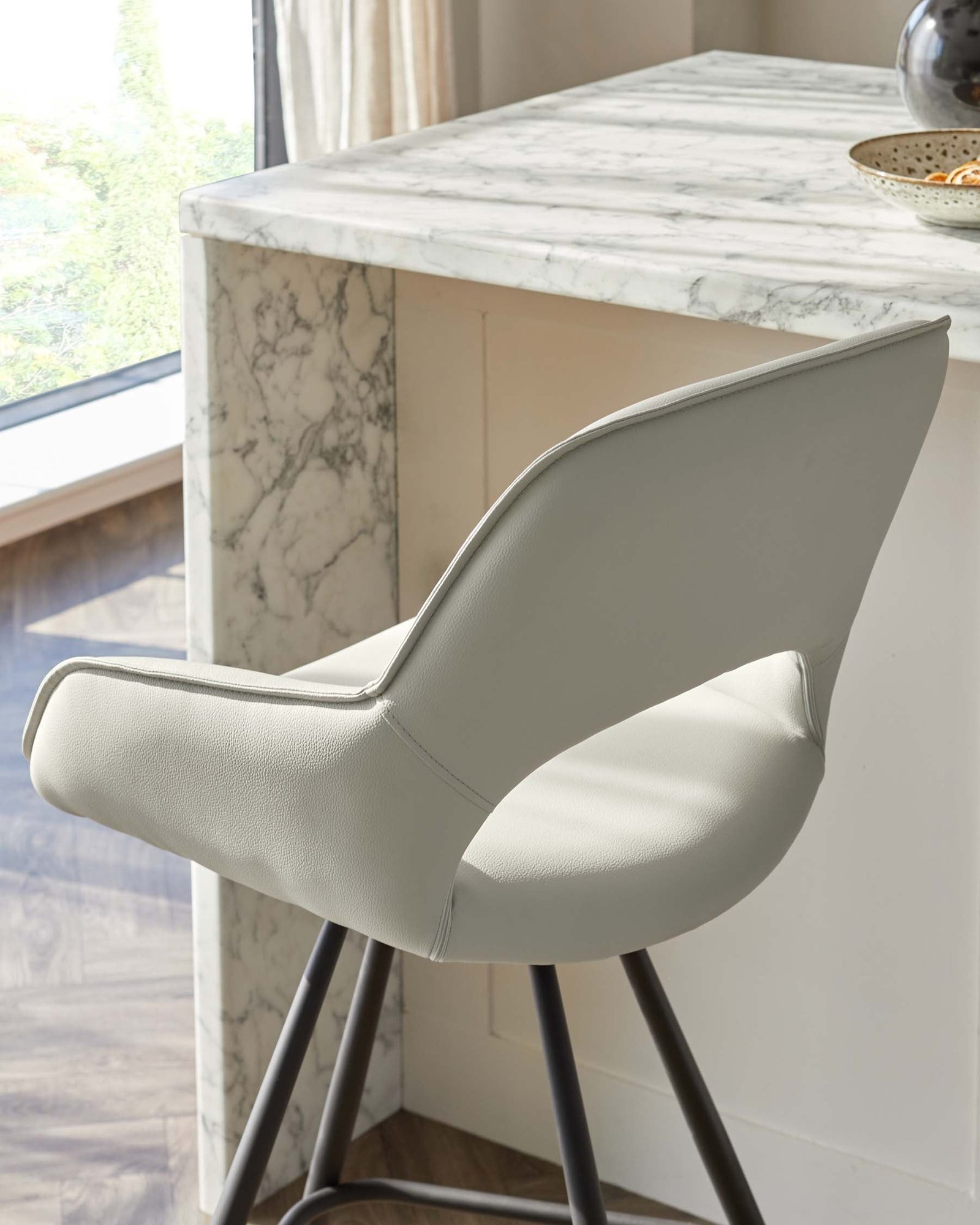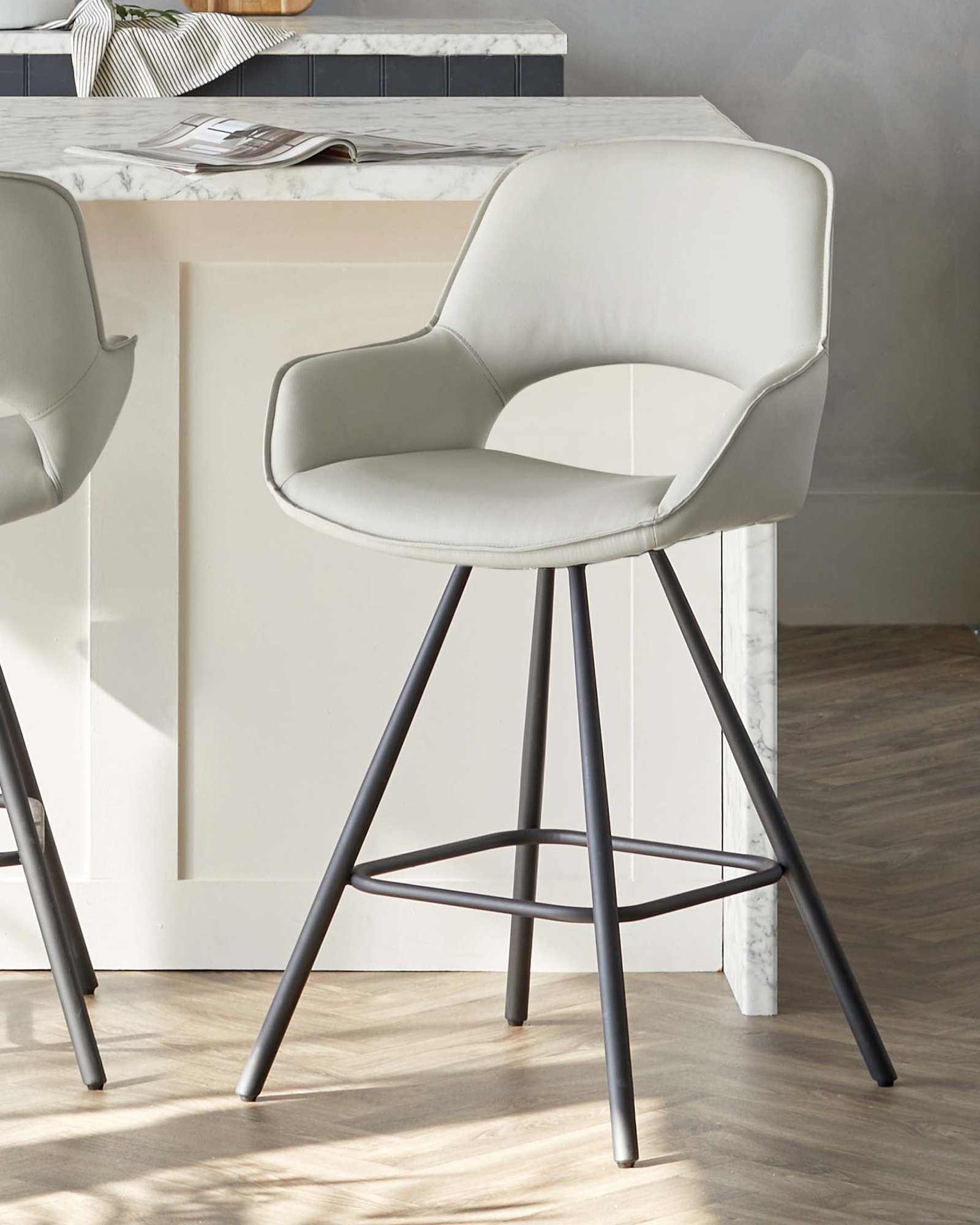 The Marlow bar stool brings sophisticated comfort to your breakfast bar or kitchen island. Its curved bucket seat, upholstered in soft light grey faux leather, cradles you perfectly while the 360-degree swivel base lets you turn with ease. Sleek black metal legs and neat piping details complete this contemporary design that’s built for both style and everyday use.
