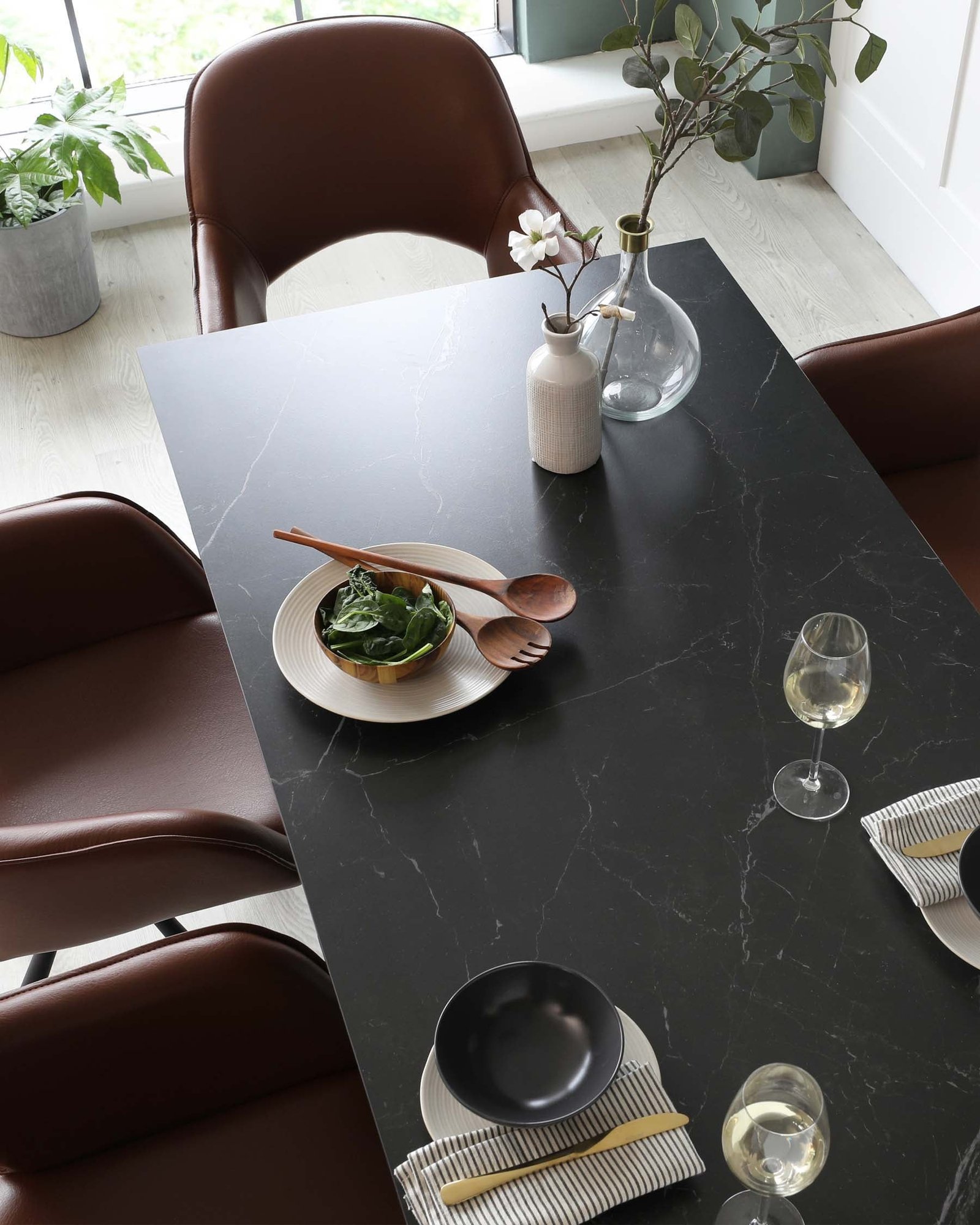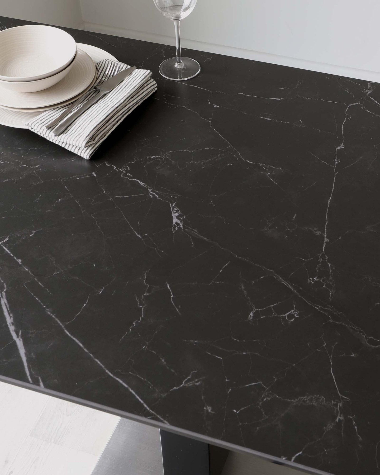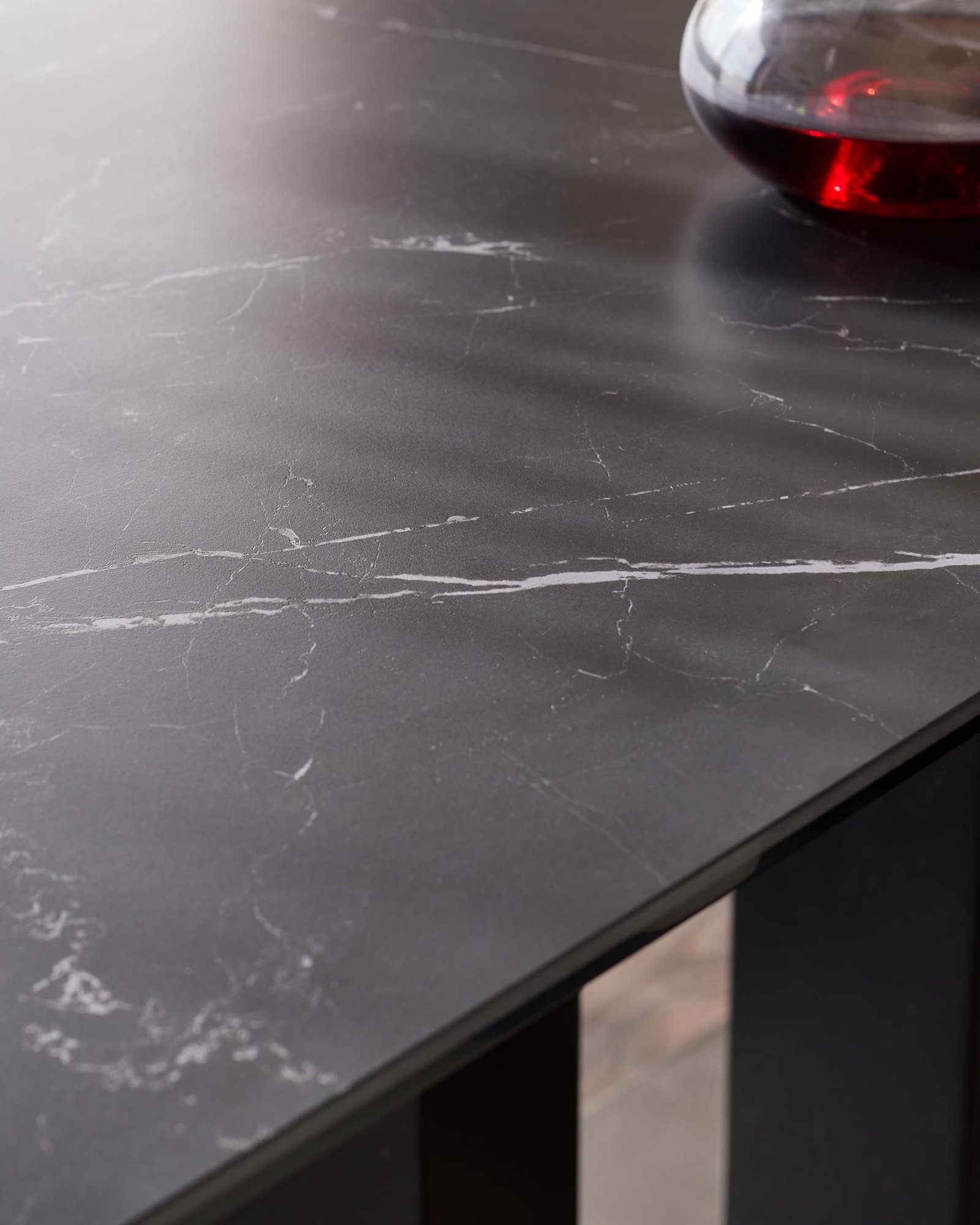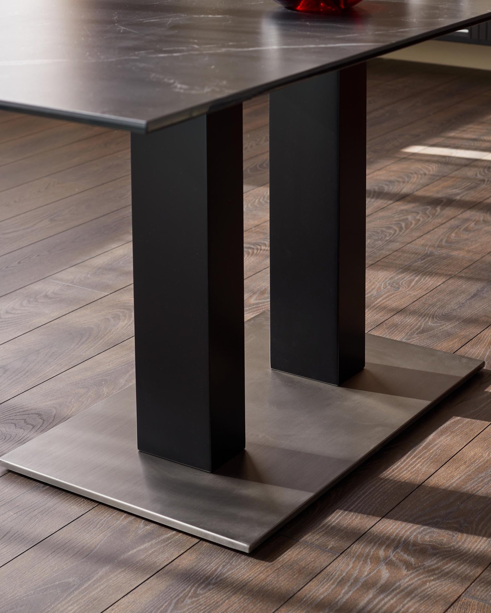 The Mia black ceramic dining table brings contemporary sophistication to mealtimes with its sleek pedestal base and scratch-resistant ceramic top. Comfortably seating 6, this striking table handles everything from hot dishes straight from the oven to dinner parties that run late. The spacious rectangular design and brushed stainless-steel accents create a centrepiece worthy of your best moments.