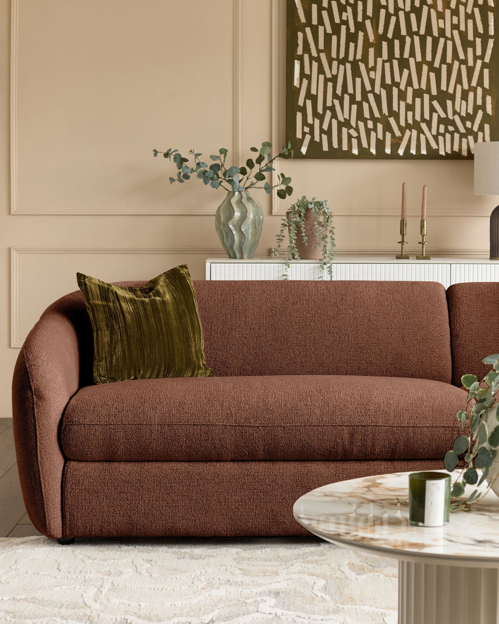 - Sculpted curves with wide armrests