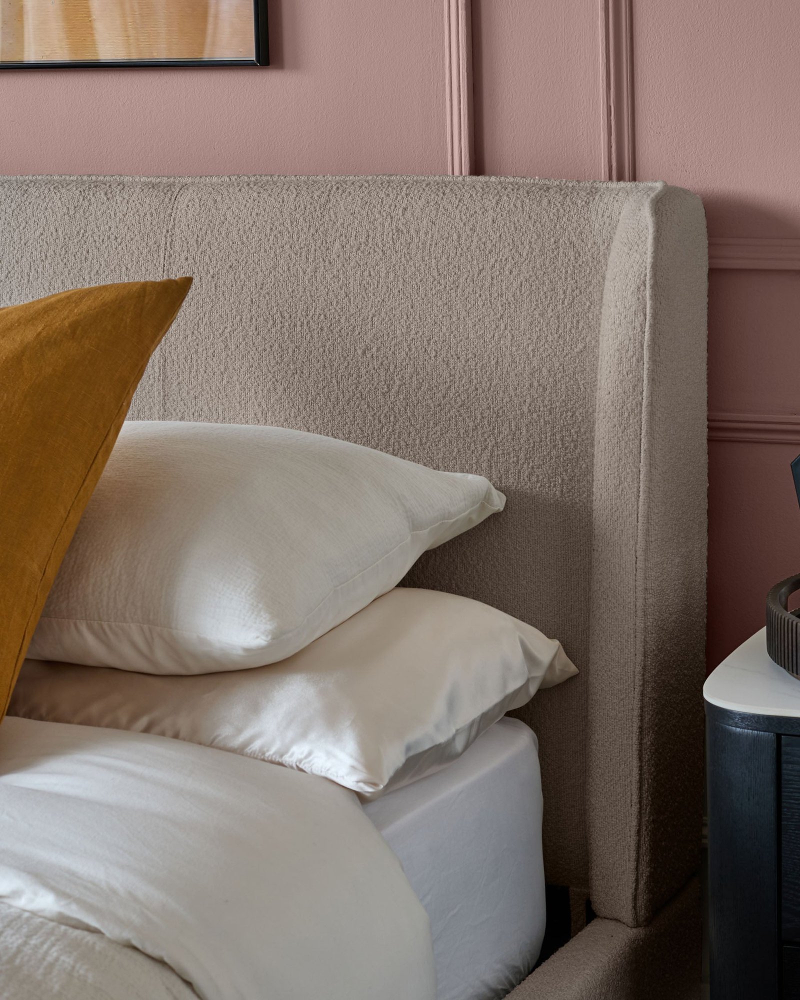 - Tall headboard with winged sides