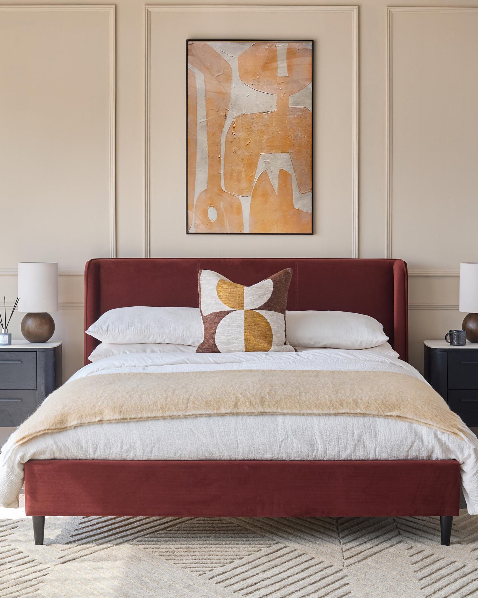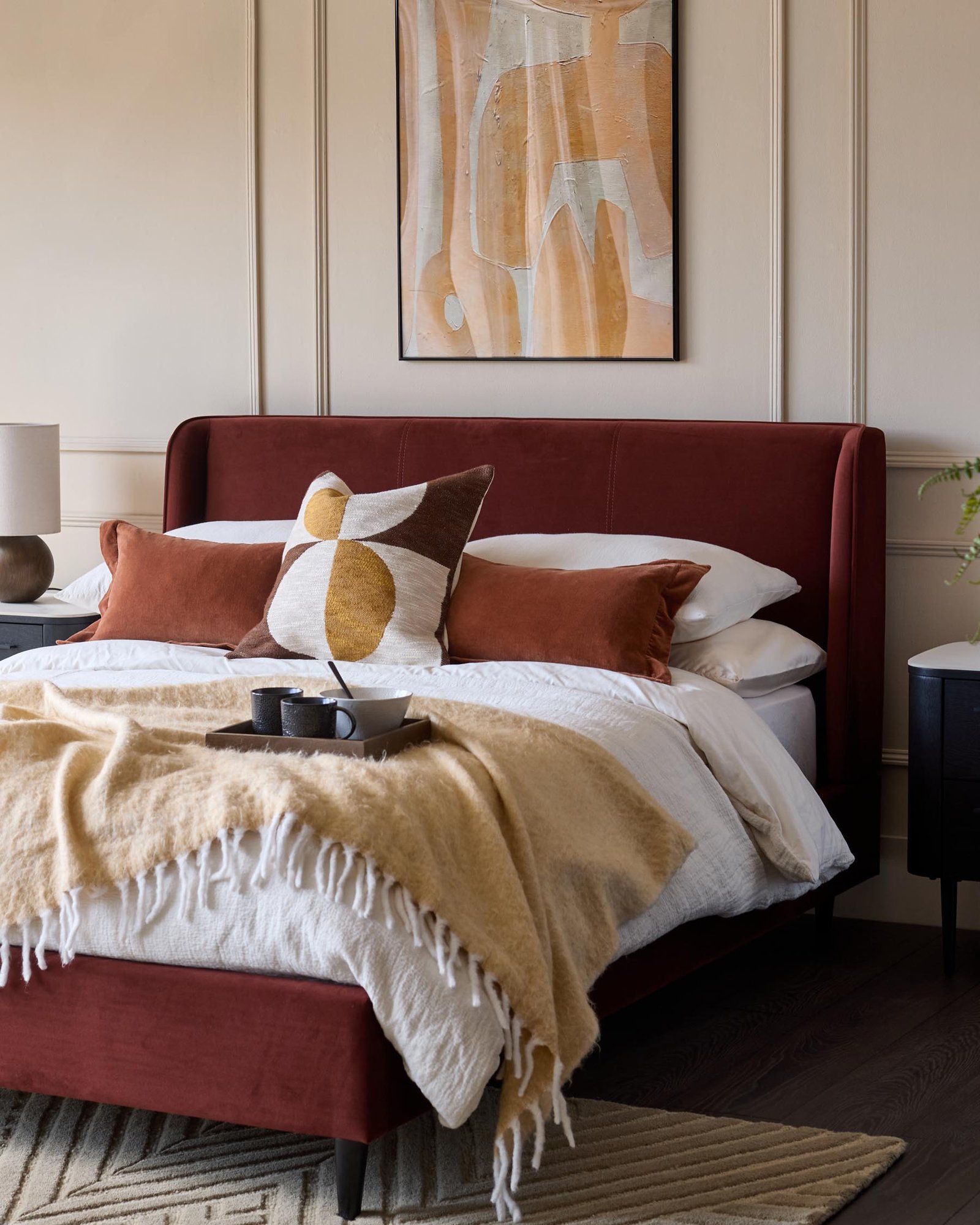 The Paolo toffee red velvet double bed brings sophisticated comfort to your bedroom with its rich, recycled velvet upholstery. The elegant winged headboard with piping detail creates a cosy retreat, while sprung slats and webbing ensure proper mattress support for restful nights. Its warm toffee red tone and clean silhouette complement both contemporary and classic bedroom styles.