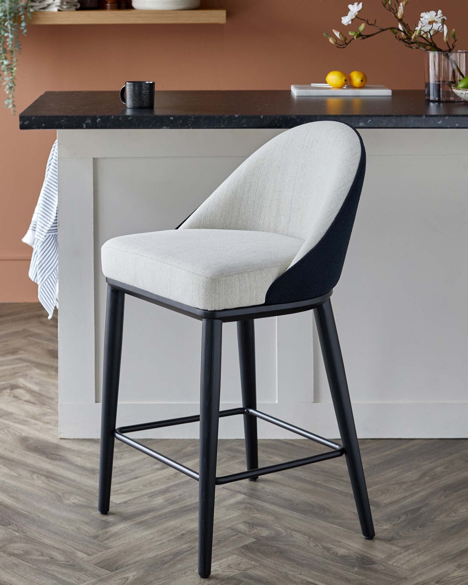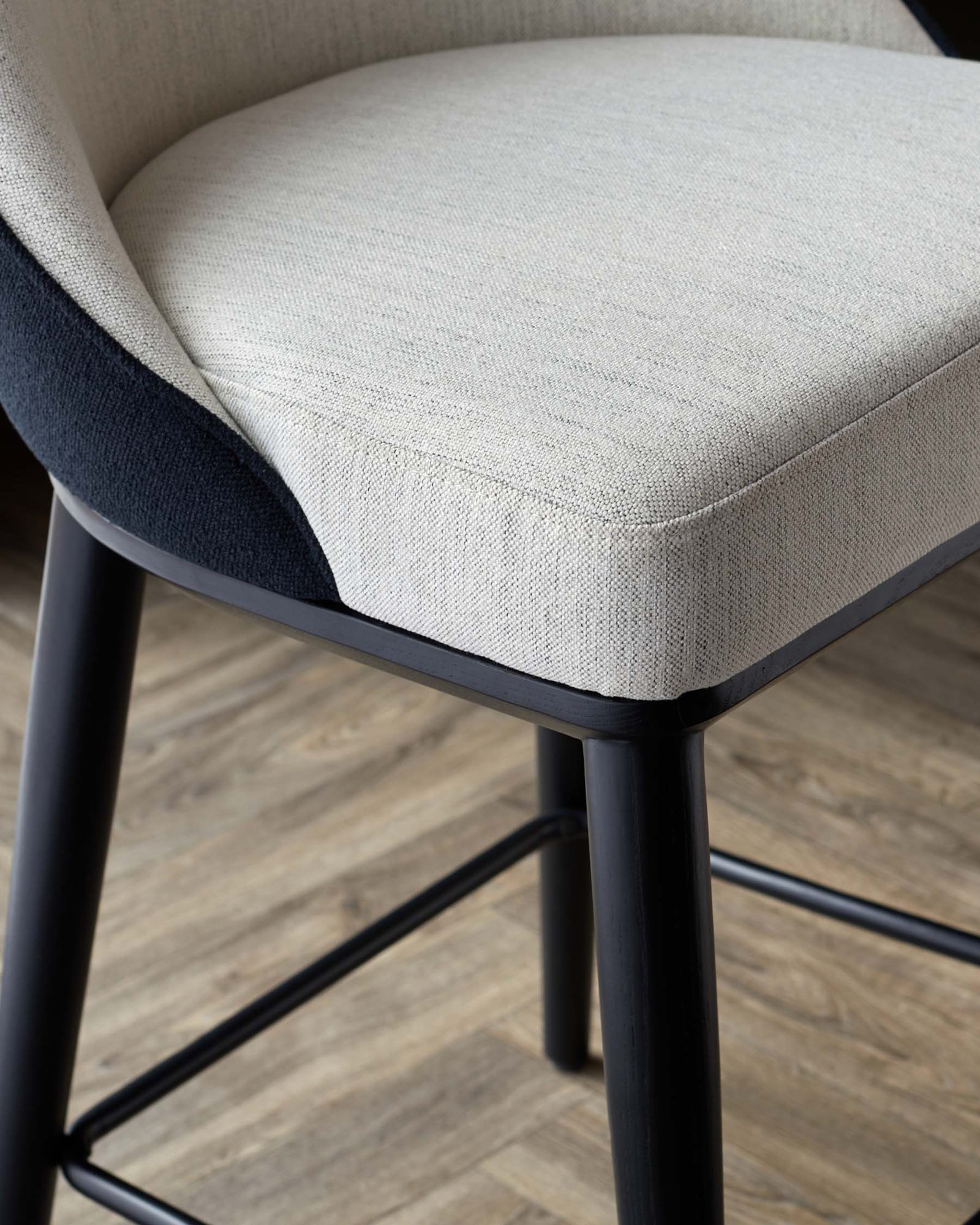 The Scarlett black mixed material bar stool brings contemporary style to your kitchen island or breakfast bar. Its two-toned upholstery combines smooth woven fabric with a luxuriously soft cushioned seat and curved backrest for lasting comfort. Sleek black ash wood legs provide durability and sophistication, making this the perfect perch for morning coffee or evening conversations.